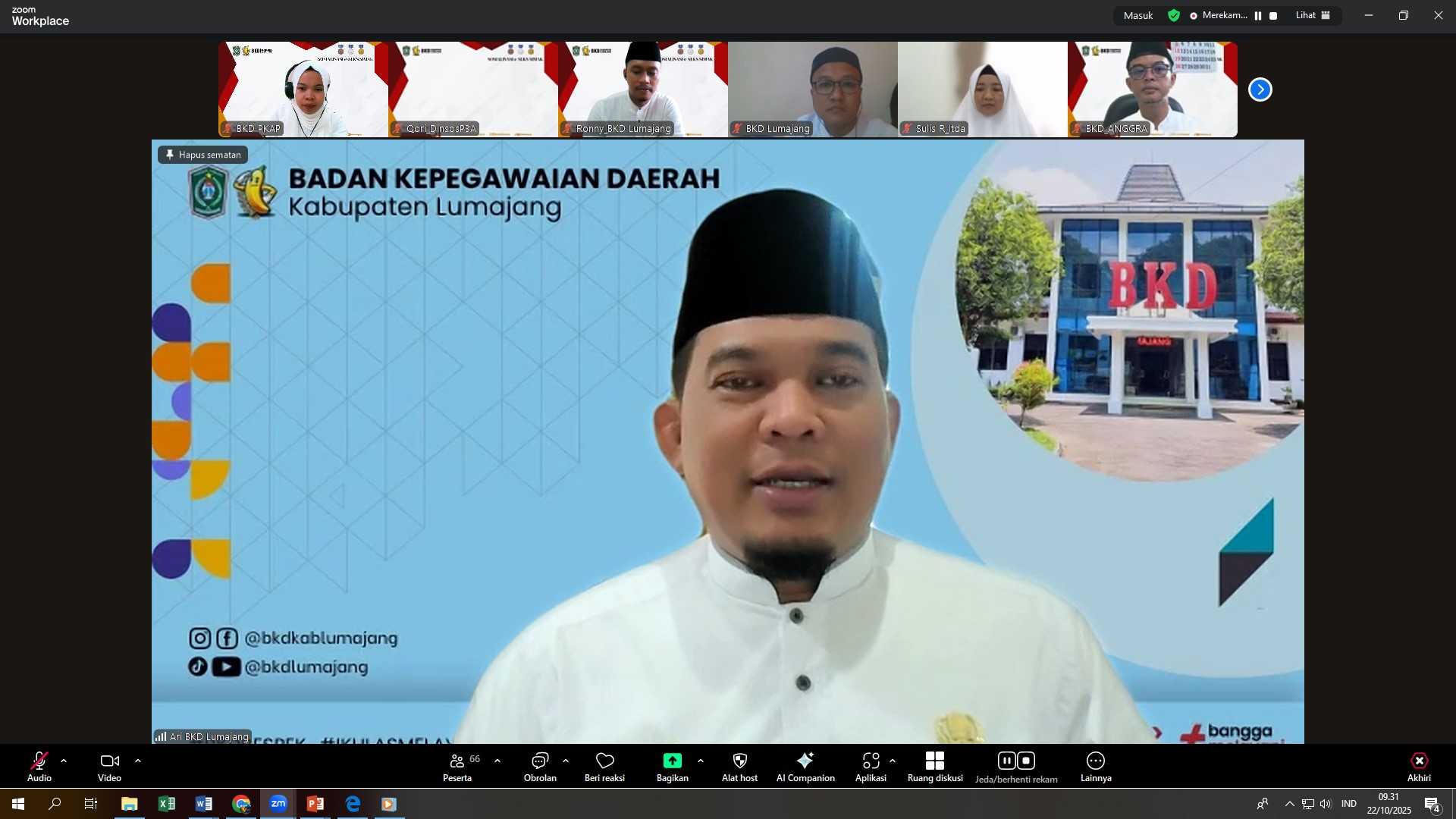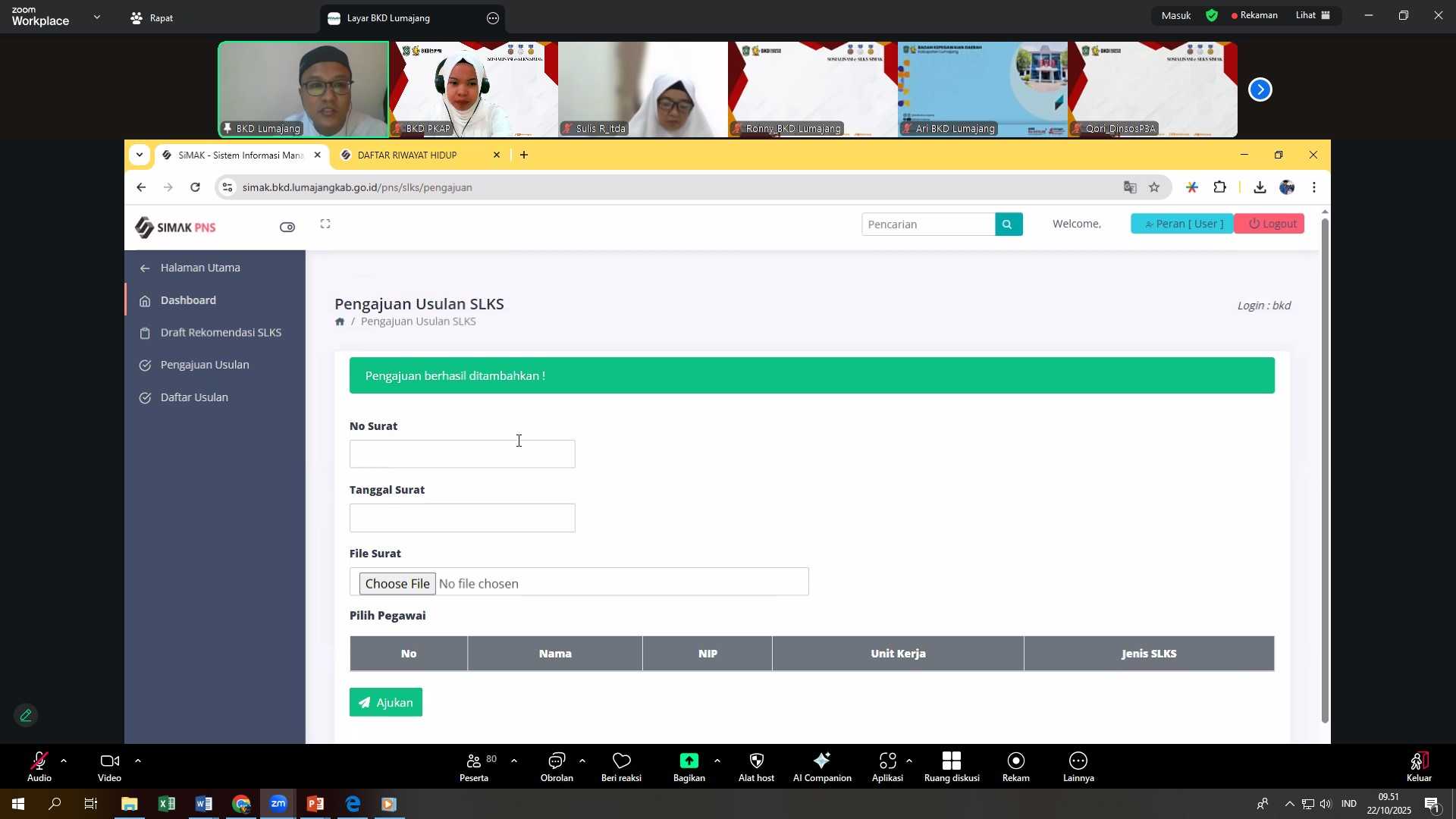 Bidang Penilaian Kinerja dan Penghargaan (PKAP) Badan Kepegawaian Daerah Kabupaten Lumajang mengadakan Kegiatan Sosialisasi pengusulan Tanda kehormatan Satyalancana Karya Satya (SLKS) melalui fitur e-slks SIMAK pada hari rabu, 22 Oktober 2025 pukul 09.00 WIB sampai dengan selesai melalui Zoom Meeting, Peserta sosialisasi e-slks SIMAK pada Hari ini adalah 84 orang pengelola kepegawaian OPD di Lingkungan Pemerintah Kabupaten Lumajang.